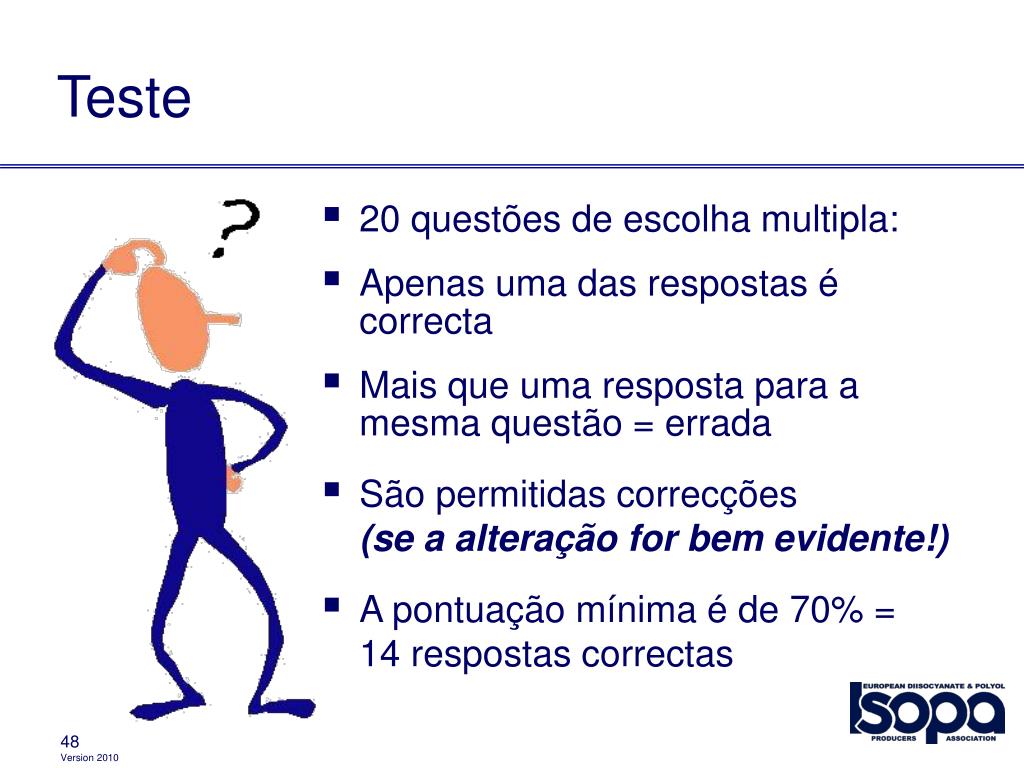 Teste • 20 questões de escolha multipla: • Apenas uma das respostas é correcta • Mais que uma resposta para a mesma questão = errada • São permitidas correcções(se a alteração for bem evidente!) • A pontuação mínima é de 70% =14 respostas correctas 48