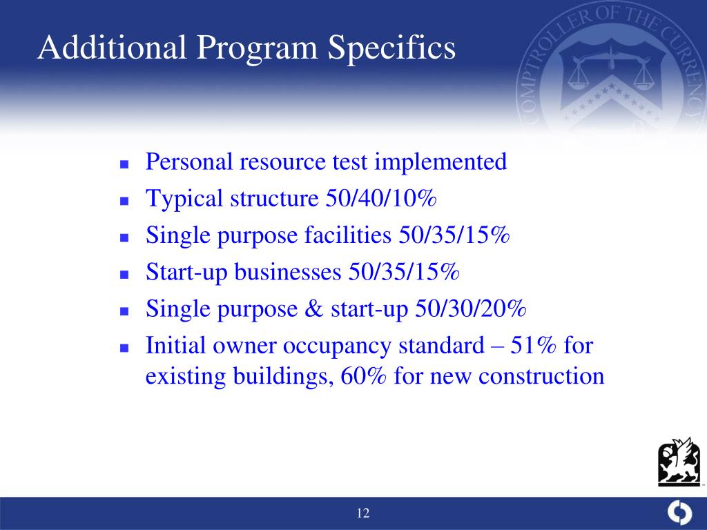 Additional Program Specifics • Personal resource test implemented • Typical structure 50/40/10% • Single purpose facilities 50/35/15% • Start-up businesses 50/35/15% • Single purpose & start-up 50/30/20% • Initial owner occupancy standard – 51% for existing buildings, 60% for new construction