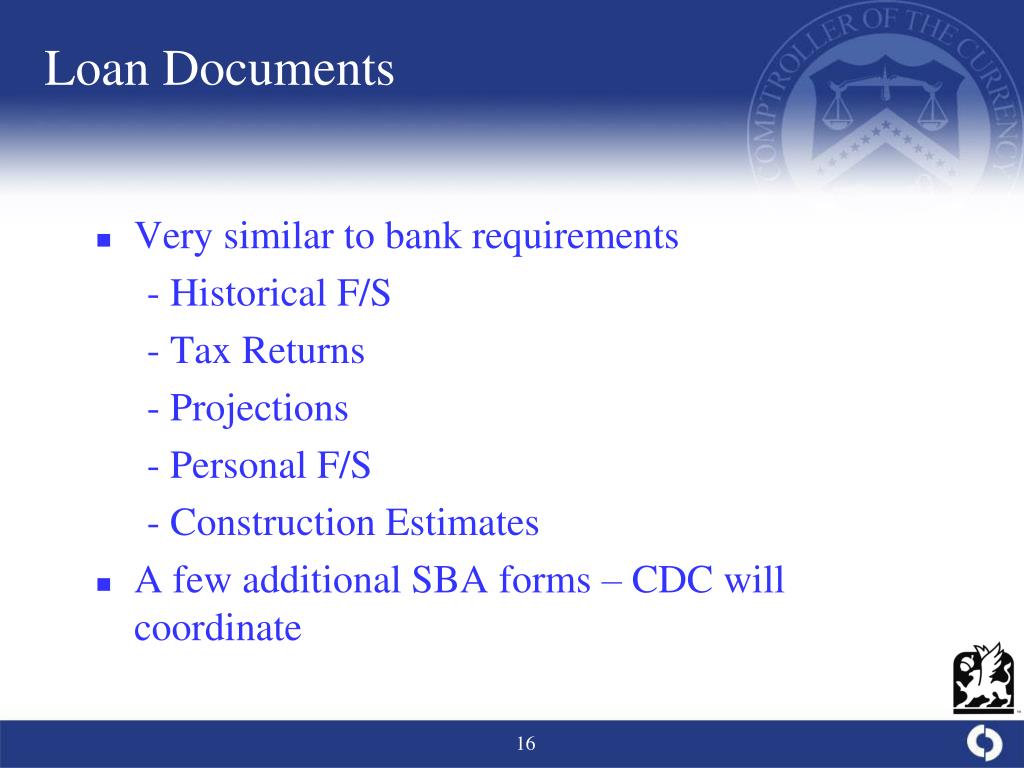 Loan Documents • Very similar to bank requirements - Historical F/S - Tax Returns - Projections - Personal F/S - Construction Estimates • A few additional SBA forms – CDC will coordinate