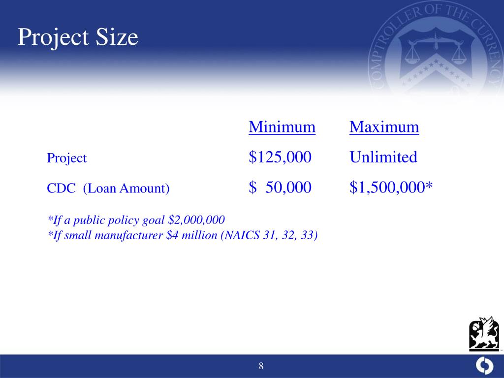 Project Size MinimumMaximum Project $125,000 Unlimited CDC (Loan Amount) $ 50,000 $1,500,000* *If a public policy goal $2,000,000 *If small manufacturer $4 million (NAICS 31, 32, 33)