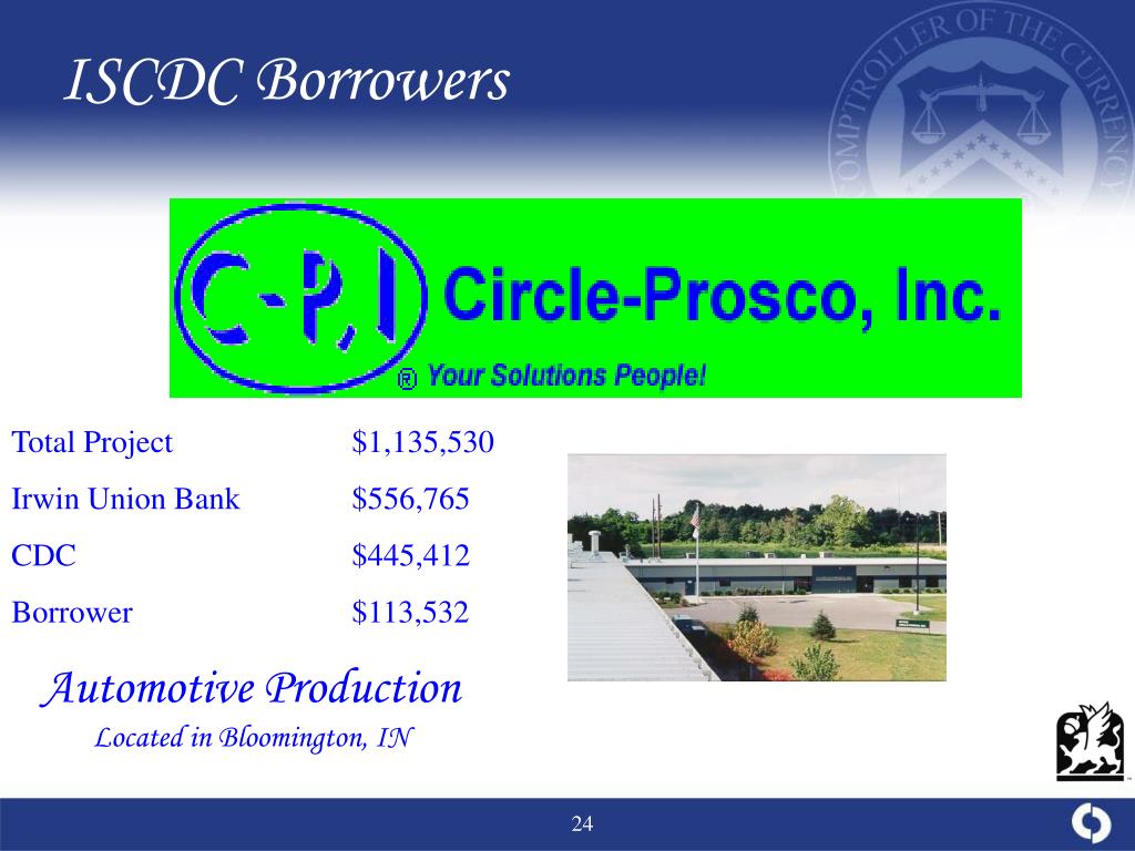 ISCDC Borrowers Total Project $1,135,530 Irwin Union Bank $556,765 CDC $445,412 Borrower $113,532 Automotive Production Located in Bloomington, IN
