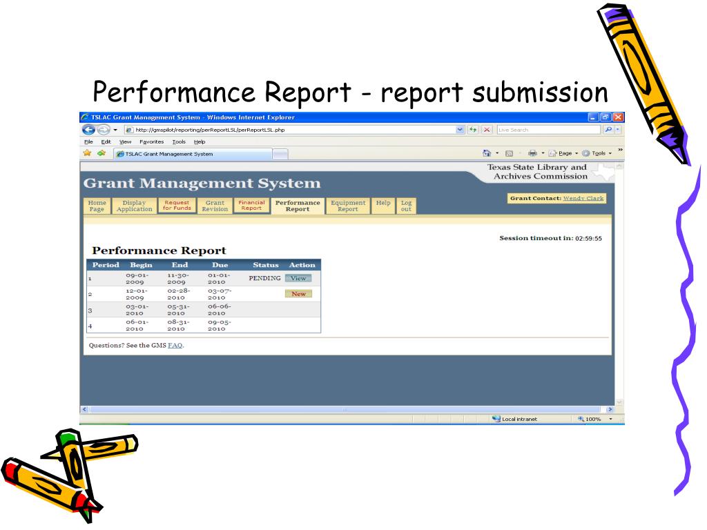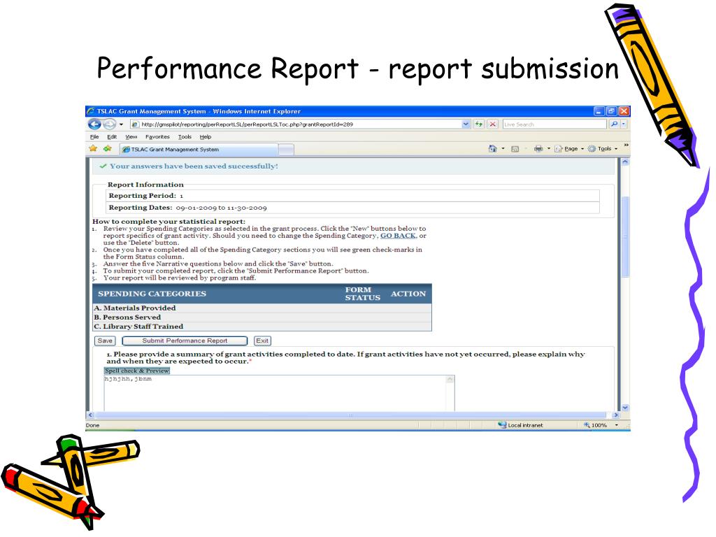 Yes! Reference your grant application (plan of action) Report items received by type Use accurate counts or best estimates Track users of computers purchased with grant funds No! Reporting entire population served Submit ‘no activity’ every report period Try to report persons or materials for items like furniture, enter a zero Performance Report Tips