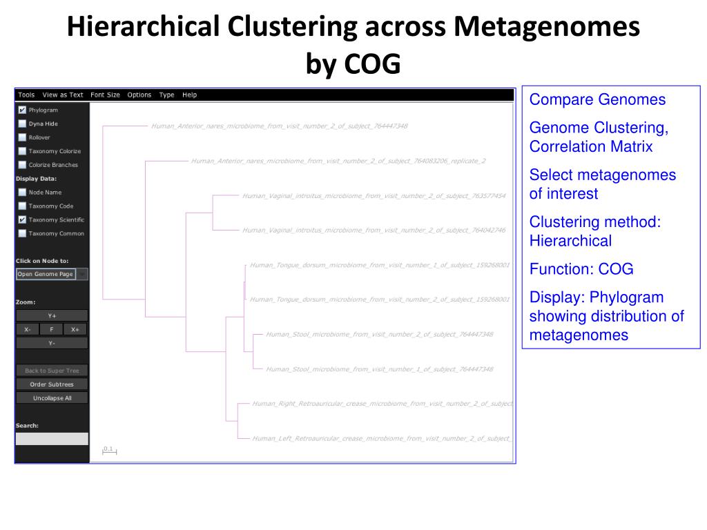 Compare Genomes Genome Clustering, Correlation Matrix Select metagenomes of interest Clustering method: Hierarchical Function: COG Display: Phylogram showing distribution of metagenomes Hierarchical Clustering across Metagenomes by COG