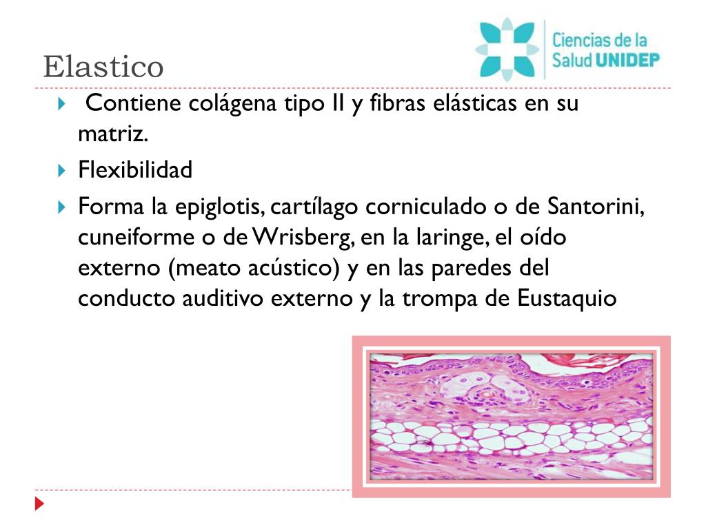 Elastico • Contiene colágena tipo II y fibras elásticas en su matriz. • Flexibilidad • Forma la epiglotis, cartílago corniculado o de Santorini, cuneiforme o de Wrisberg, en la laringe, el oído externo (meato acústico) y en las paredes del conducto auditivo externo y la trompa de Eustaquio