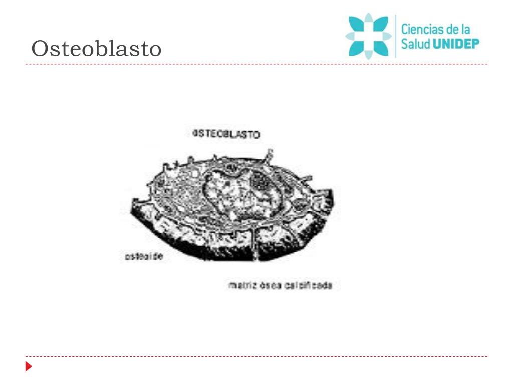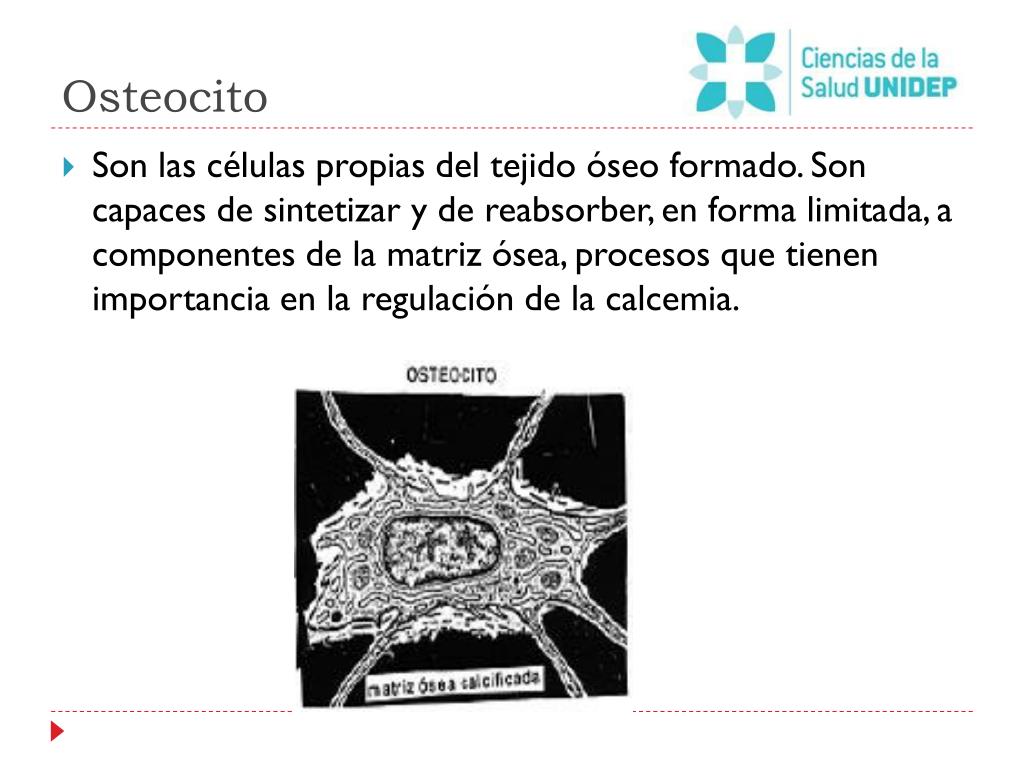 Osteocito • Son las células propias del tejido óseo formado. Son capaces de sintetizar y de reabsorber, en forma limitada, a componentes de la matriz ósea, procesos que tienen importancia en la regulación de la calcemia.