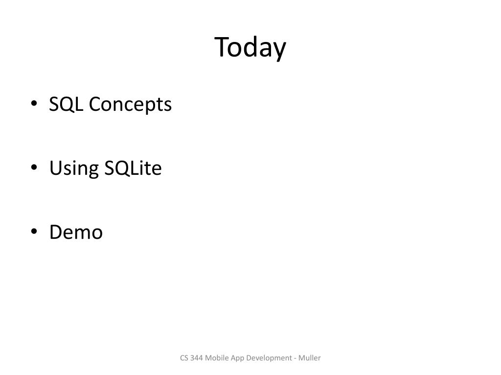 Today • SQL Concepts • Using SQLite • Demo CS 344 Mobile App Development - Muller