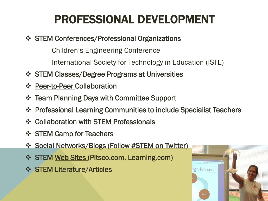 Professional development • STEM Conferences/Professional Organizations • Children’s Engineering Conference • International Society for Technology in Education (ISTE) • STEM Classes/Degree Programs at Universities • Peer-to-Peer Collaboration • Team Planning Days with Committee Support • Professional Learning Communities to include Specialist Teachers • Collaboration with STEM Professionals • STEM Camp for Teachers • Social Networks/Blogs (Follow #STEM on Twitter) • STEM Web Sites (Pitsco.com, Learning.com) • STEM Literature/Articles