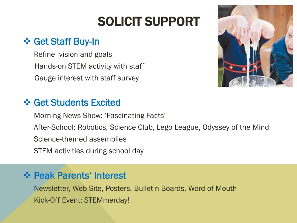 Solicit support • Get Staff Buy-In • Refine vision and goals • Hands-on STEM activity with staff • Gauge interest with staff survey • Get Students Excited • Morning News Show: ‘Fascinating Facts’ • After-School: Robotics, Science Club, Lego League, Odyssey of the Mind • Science-themed assemblies • STEM activities during school day • Peak Parents’ Interest • Newsletter, Web Site, Posters, Bulletin Boards, Word of Mouth • Kick-Off Event: STEMmerday!