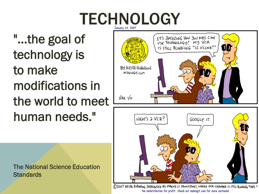 technology "...the goal of technology is to make modifications in the world to meet human needs." The National Science Education Standards