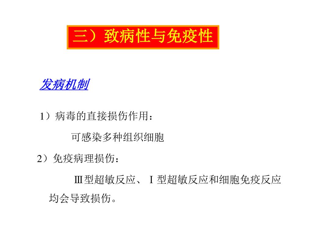 三)致病性与免疫性 1)病毒的直接损伤作用: 可感染多种组织细胞 2)免疫病理损伤: Ⅲ型超敏反应、Ⅰ型超敏反应和细胞免疫反应均会导致损伤。 发病机制