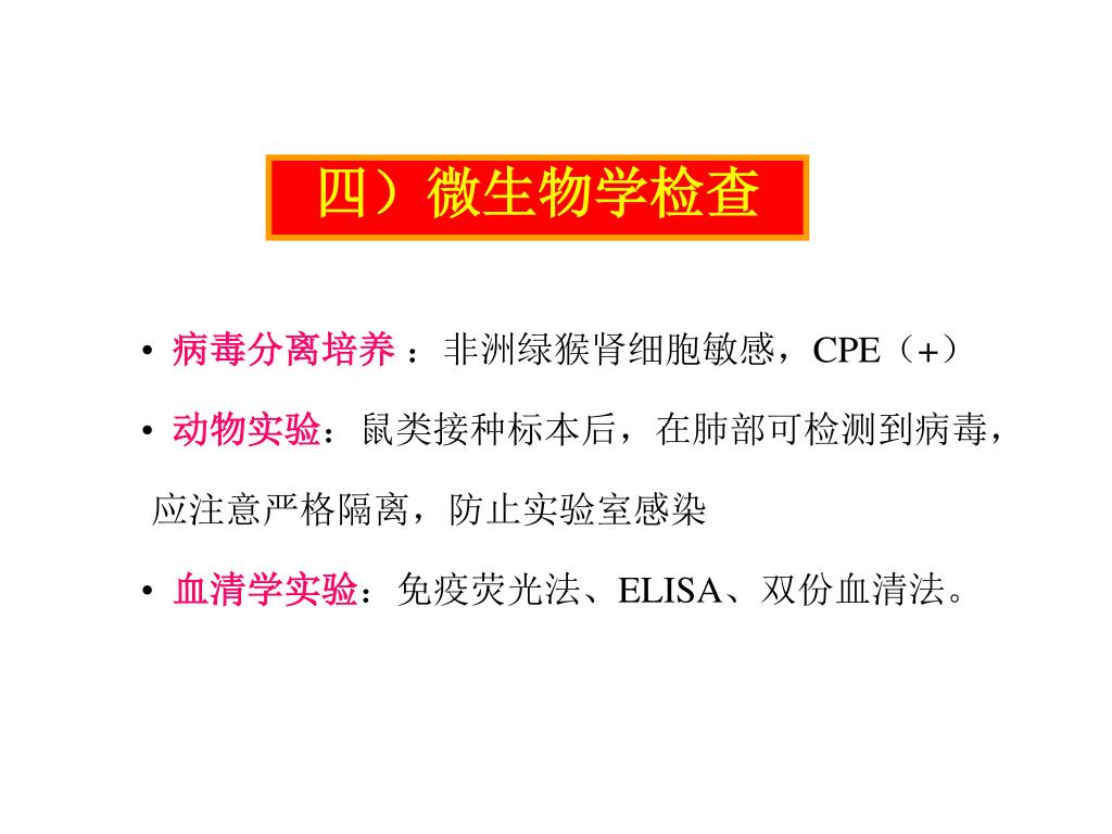 四)微生物学检查 • 病毒分离培养 :非洲绿猴肾细胞敏感,CPE(+) • 动物实验:鼠类接种标本后,在肺部可检测到病毒,应注意严格隔离,防止实验室感染 • 血清学实验:免疫荧光法、ELISA、双份血清法。