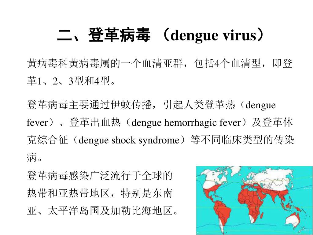 二、登革病毒 (dengue virus) 黄病毒科黄病毒属的一个血清亚群,包括4个血清型,即登革1、2、3型和4型。 登革病毒主要通过伊蚊传播,引起人类登革热(dengue fever)、登革出血热(dengue hemorrhagic fever)及登革休克综合征(dengue shock syndrome)等不同临床类型的传染病。 登革病毒感染广泛流行于全球的热带和亚热带地区,特别是东南亚、太平洋岛国及加勒比海地区。