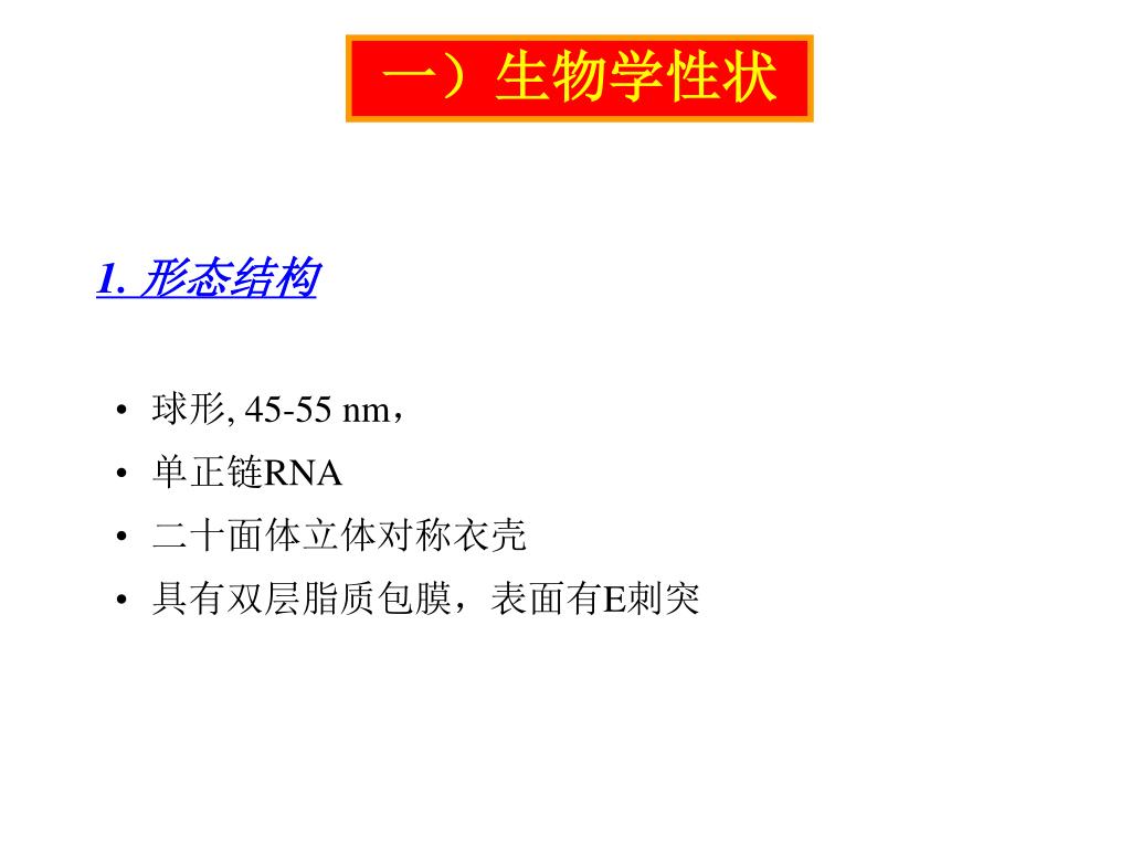 一)生物学性状 1. 形态结构 • 球形, 45-55 nm, • 单正链RNA • 二十面体立体对称衣壳 • 具有双层脂质包膜,表面有E刺突