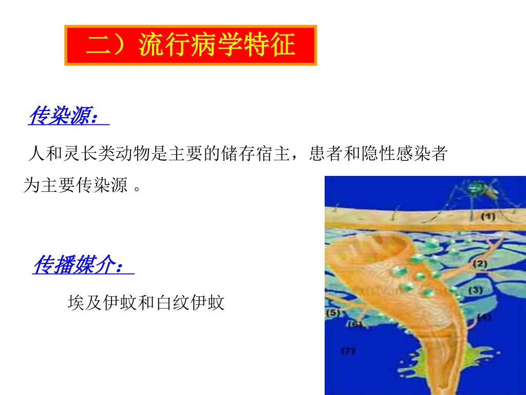 二)流行病学特征 传染源: 人和灵长类动物是主要的储存宿主,患者和隐性感染者为主要传染源 。 传播媒介: 埃及伊蚊和白纹伊蚊