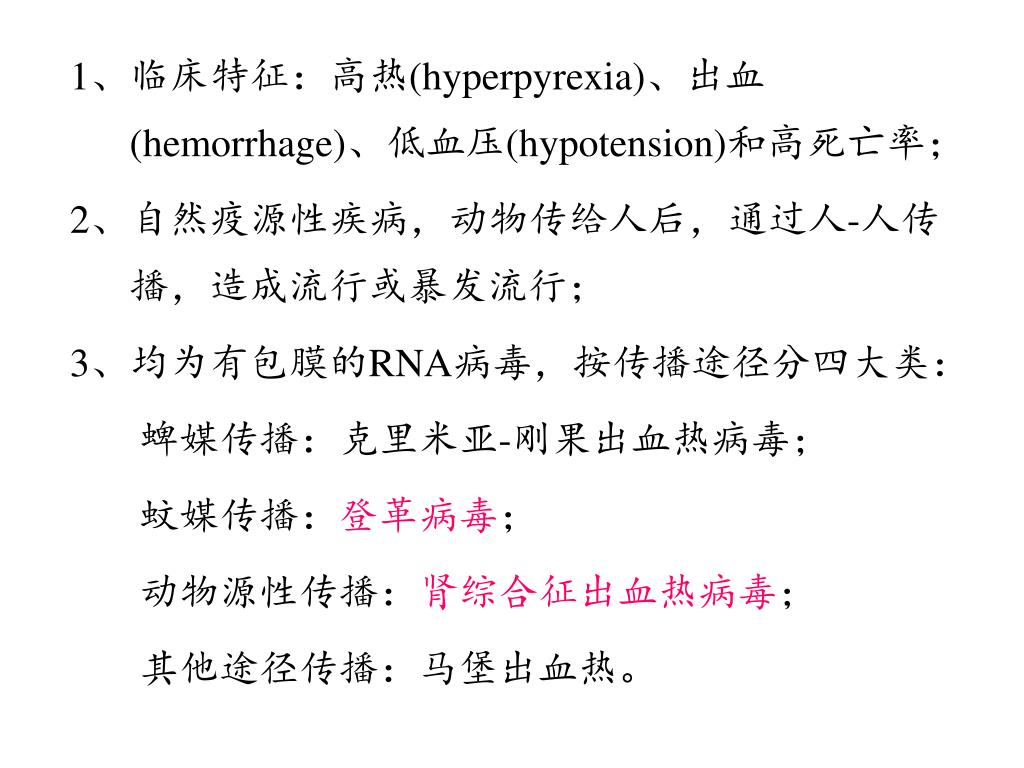 1、临床特征:高热(hyperpyrexia)、出血(hemorrhage)、低血压(hypotension)和高死亡率;1、临床特征:高热(hyperpyrexia)、出血(hemorrhage)、低血压(hypotension)和高死亡率; 2、自然疫源性疾病,动物传给人后,通过人-人传播,造成流行或暴发流行; 3、均为有包膜的RNA病毒,按传播途径分四大类: 蜱媒传播:克里米亚-刚果出血热病毒; 蚊媒传播:登革病毒; 动物源性传播:肾综合征出血热病毒; 其他途径传播:马堡出血热。