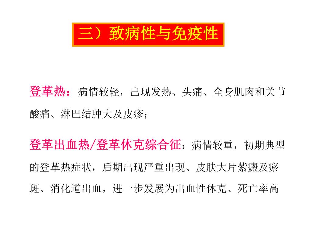 三)致病性与免疫性 登革热:病情较轻,出现发热、头痛、全身肌肉和关节酸痛、淋巴结肿大及皮疹; 登革出血热/登革休克综合征:病情较重,初期典型的登革热症状,后期出现严重出现、皮肤大片紫癜及瘀斑、消化道出血,进一步发展为出血性休克、死亡率高