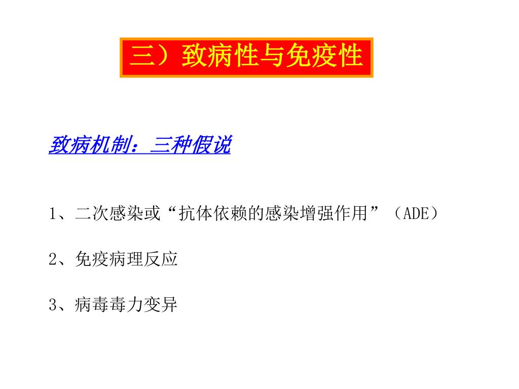 三)致病性与免疫性 致病机制:三种假说 1、二次感染或“抗体依赖的感染增强作用”(ADE) 2、免疫病理反应 3、病毒毒力变异