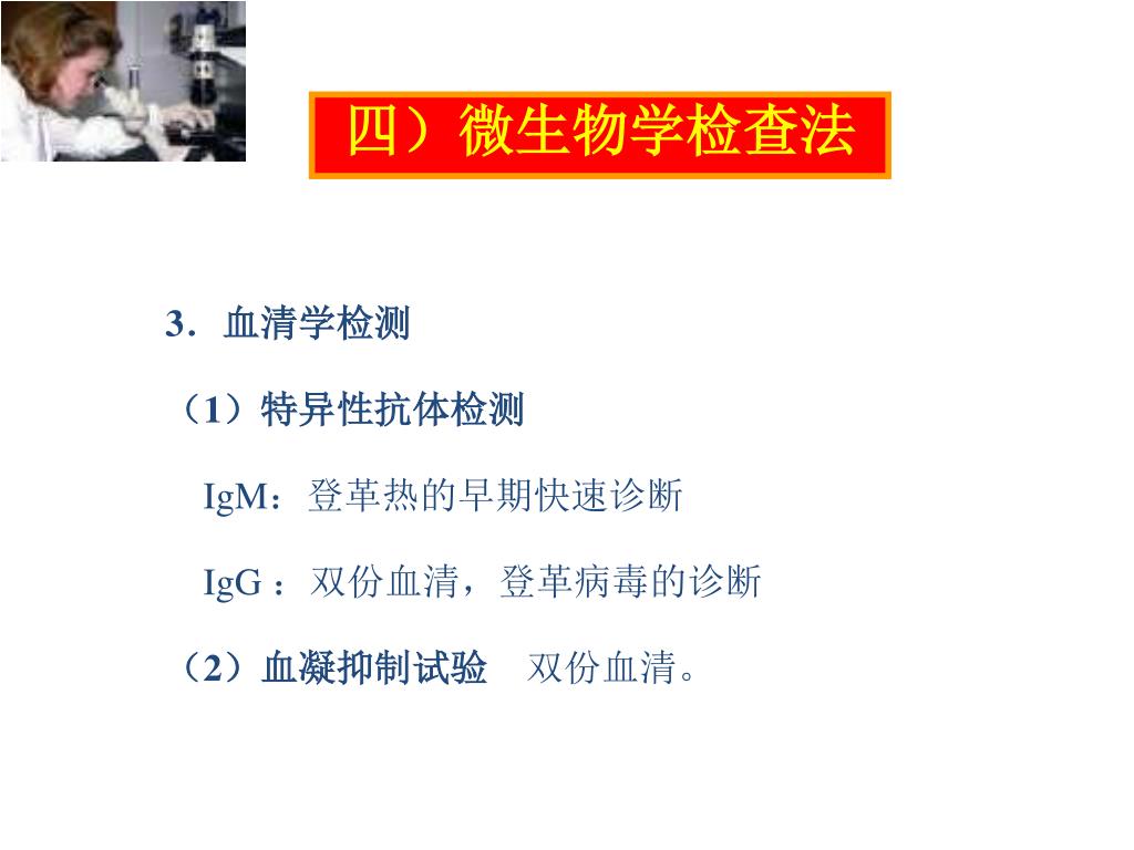 四)微生物学检查法 3.血清学检测 (1)特异性抗体检测 IgM:登革热的早期快速诊断 IgG :双份血清,登革病毒的诊断 (2)血凝抑制试验 双份血清。