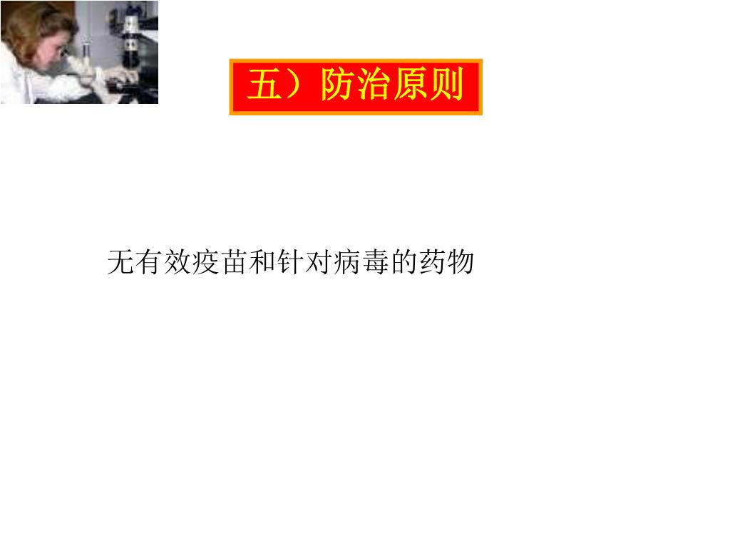 五)防治原则 • 灭鼠、防鼠 • 注意个人防护 • 尚无特效治疗方法,病毒唑、免疫球蛋白的早期应用有一定疗效 • 目前只有HFRS疫苗可供预防。