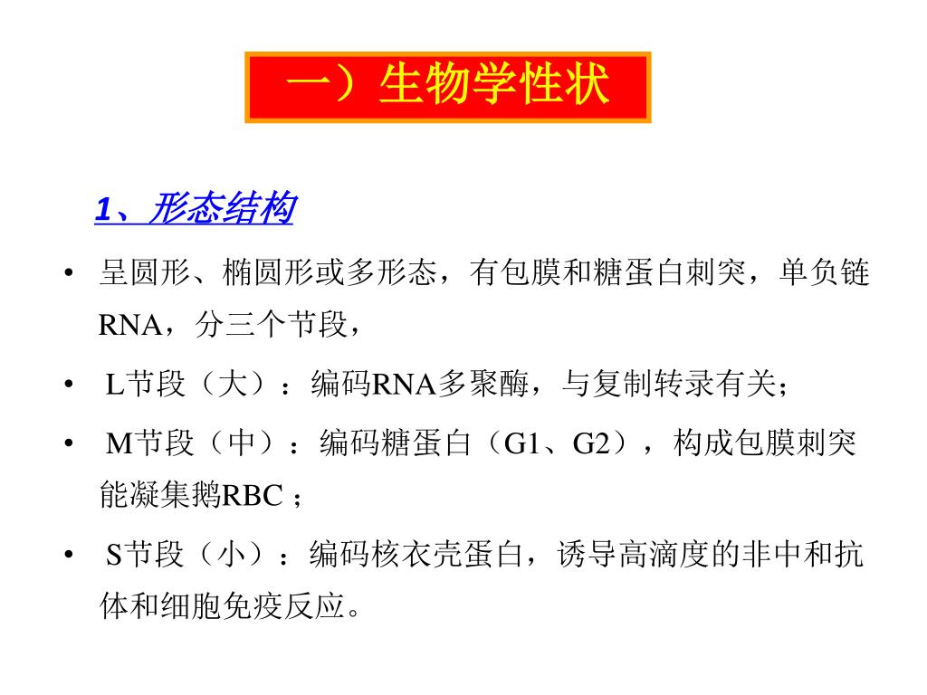 一)生物学性状 • 呈圆形、椭圆形或多形态,有包膜和糖蛋白刺突,单负链RNA,分三个节段, • L节段(大):编码RNA多聚酶,与复制转录有关; • M节段(中):编码糖蛋白(G1、G2),构成包膜刺突能凝集鹅RBC ; • S节段(小):编码核衣壳蛋白,诱导高滴度的非中和抗体和细胞免疫反应。 1、形态结构