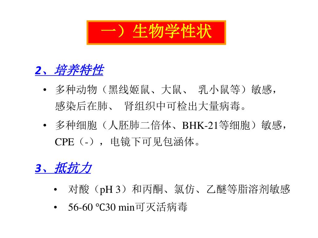一)生物学性状 • 多种动物(黑线姬鼠、大鼠、 乳小鼠等)敏感,感染后在肺、 肾组织中可检出大量病毒。 • 多种细胞(人胚肺二倍体、BHK-21等细胞)敏感,CPE(-),电镜下可见包涵体。 2、培养特性 3、抵抗力 • 对酸(pH 3)和丙酮、氯仿、乙醚等脂溶剂敏感 • 56-60 ℃30 min可灭活病毒