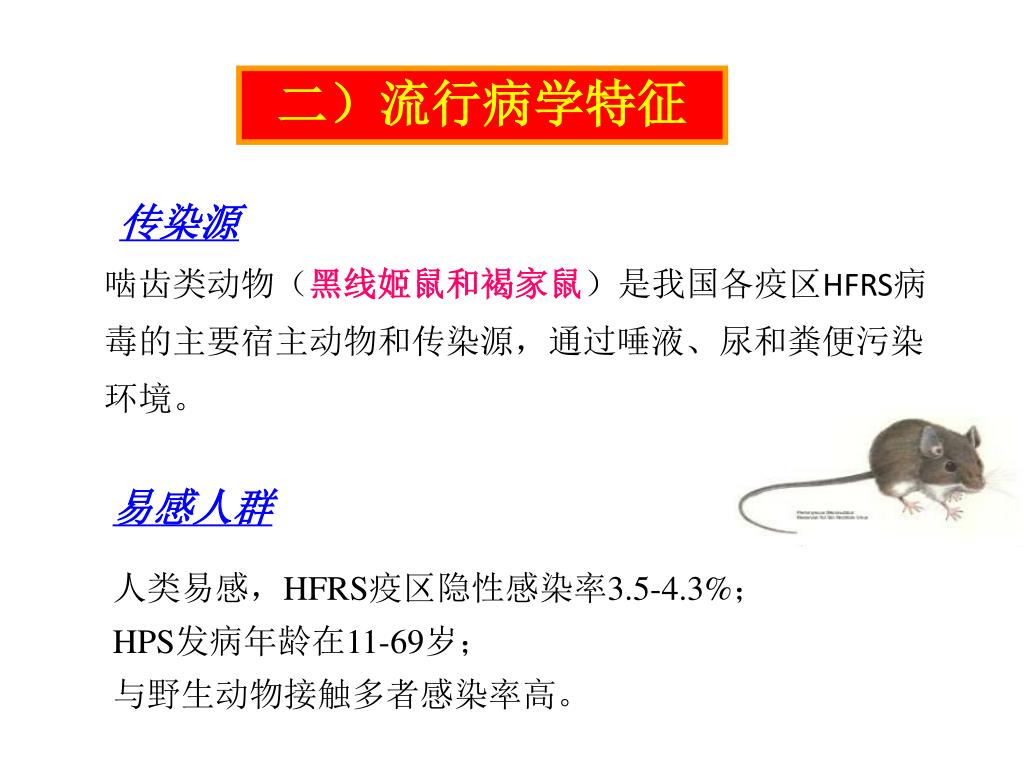 传染源 二)流行病学特征 啮齿类动物(黑线姬鼠和褐家鼠)是我国各疫区HFRS病毒的主要宿主动物和传染源,通过唾液、尿和粪便污染环境。 易感人群 人类易感,HFRS疫区隐性感染率3.5-4.3%; HPS发病年龄在11-69岁; 与野生动物接触多者感染率高。