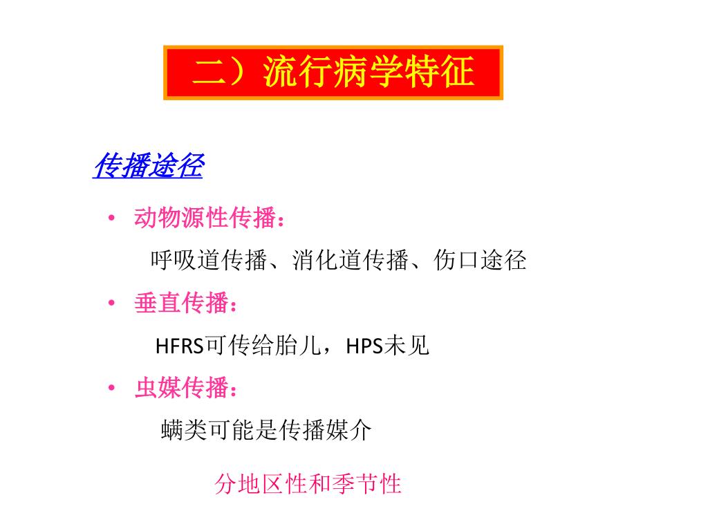 传播途径 二)流行病学特征 • 动物源性传播: 呼吸道传播、消化道传播、伤口途径 • 垂直传播: HFRS可传给胎儿,HPS未见 • 虫媒传播: 螨类可能是传播媒介 分地区性和季节性