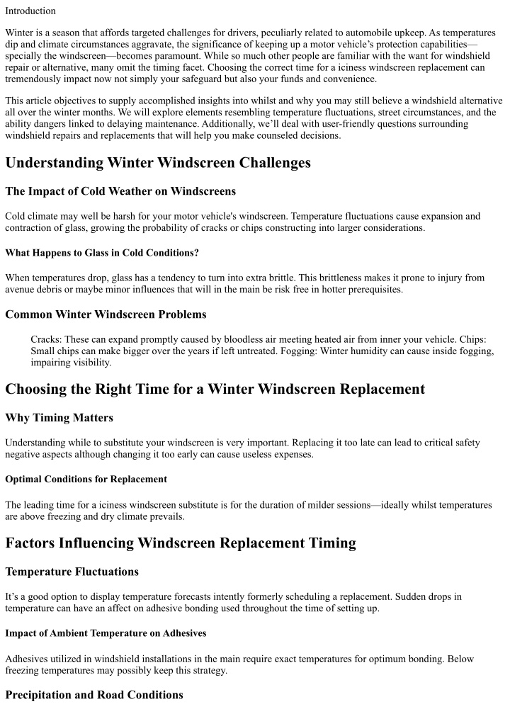 Introduction Winter is a season that affords targeted challenges for drivers, peculiarly related to automobile upkeep. As temperatures dip and climate circumstances aggravate, the significance of keeping up a motor vehicle’s protection capabilities— specially the windscreen—becomes paramount. While so much other people are familiar with the want for windshield repair or alternative, many omit the timing facet. Choosing the correct time for a iciness windscreen replacement can tremendously impact now not simply your safeguard but also your funds and convenience. This article objectives to supply accomplished insights into whilst and why you may still believe a windshield alternative all over the winter months. We will explore elements resembling temperature fluctuations, street circumstances, and the ability dangers linked to delaying maintenance. Additionally, we’ll deal with user-friendly questions surrounding windshield repairs and replacements that will help you make counseled decisions. Understanding Winter Windscreen Challenges The Impact of Cold Weather on Windscreens Cold climate may well be harsh for your motor vehicle's windscreen. Temperature fluctuations cause expansion and contraction of glass, growing the probability of cracks or chips constructing into larger considerations. What Happens to Glass in Cold Conditions? When temperatures drop, glass has a tendency to turn into extra brittle. This brittleness makes it prone to injury from avenue debris or maybe minor influences that will in the main be risk free in hotter prerequisites. Common Winter Windscreen Problems Cracks: These can expand promptly caused by bloodless air meeting heated air from inner your vehicle. Chips: Small chips can make bigger over the years if left untreated. Fogging: Winter humidity can cause inside fogging, impairing visibility. Choosing the Right Time for a Winter Windscreen Replacement Why Timing Matters Understanding while to substitute your windscreen is very important. Replacing it too late can lead to critical safety negative aspects although changing it too early can cause useless expenses. Optimal Conditions for Replacement The leading time for a iciness windscreen substitute is for the duration of milder sessions—ideally whilst temperatures are above freezing and dry climate prevails. Factors Influencing Windscreen Replacement Timing Temperature Fluctuations It’s a good option to display temperature forecasts intently formerly scheduling a replacement. Sudden drops in temperature can have an affect on adhesive bonding used throughout the time of setting up. Impact of Ambient Temperature on Adhesives Adhesives utilized in windshield installations in the main require exact temperatures for optimum bonding. Below freezing temperatures may possibly keep this strategy. Precipitation and Road Conditions