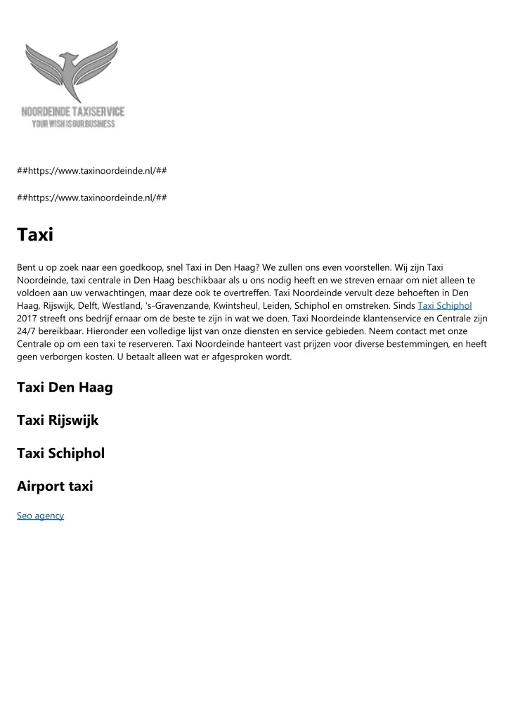 ##https://www.taxinoordeinde.nl/## ##https://www.taxinoordeinde.nl/## Taxi Bent u op zoek naar een goedkoop, snel Taxi in Den Haag? We zullen ons even voorstellen. Wij zijn Taxi Noordeinde, taxi centrale in Den Haag beschikbaar als u ons nodig heeft en we streven ernaar om niet alleen te voldoen aan uw verwachtingen, maar deze ook te overtreffen. Taxi Noordeinde vervult deze behoeften in Den Haag, Rijswijk, Delft, Westland, 's-Gravenzande, Kwintsheul, Leiden, Schiphol en omstreken. Sinds Taxi Schiphol 2017 streeft ons bedrijf ernaar om de beste te zijn in wat we doen. Taxi Noordeinde klantenservice en Centrale zijn 24/7 bereikbaar. Hieronder een volledige lijst van onze diensten en service gebieden. Neem contact met onze Centrale op om een taxi te reserveren. Taxi Noordeinde hanteert vast prijzen voor diverse bestemmingen, en heeft geen verborgen kosten. U betaalt alleen wat er afgesproken wordt. Taxi Den Haag Taxi Rijswijk Taxi Schiphol Airport taxi Seo agency