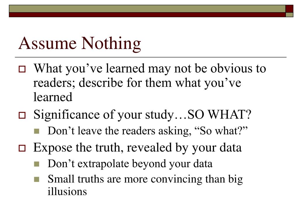 Assume Nothing • What you’ve learned may not be obvious to readers; describe for them what you’ve learned • Significance of your study…SO WHAT? • Don’t leave the readers asking, “So what?” • Expose the truth, revealed by your data • Don’t extrapolate beyond your data • Small truths are more convincing than big illusions