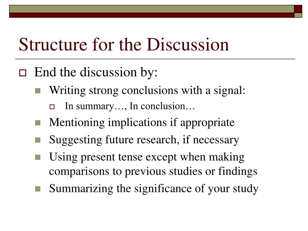Structure for the Discussion • Transition to the middle of the discussion by: • Interpreting your results • Discussing key studies—only those relevant to your work • Comparing your work with others’ work • Presenting ambiguous results and discrepancies with others’ studies objectively • Explaining unexpected findings • Describing limitations briefly