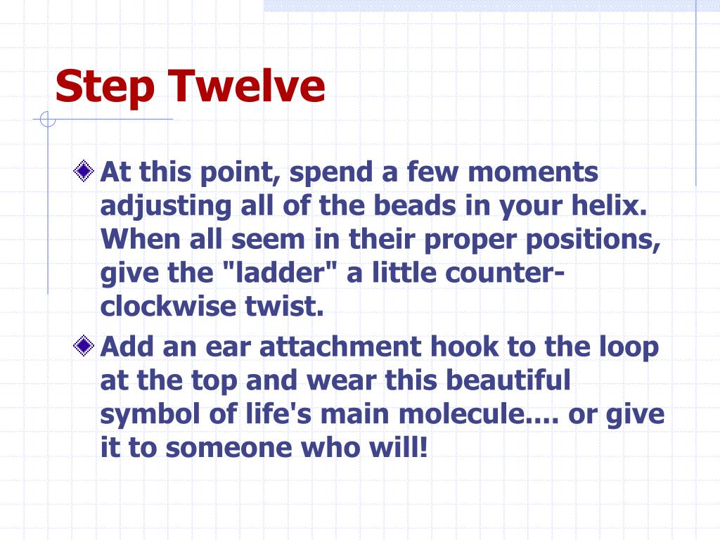 Step Twelve • At this point, spend a few moments adjusting all of the beads in your helix. When all seem in their proper positions, give the "ladder" a little counter-clockwise twist. • Add an ear attachment hook to the loop at the top and wear this beautiful symbol of life's main molecule.... or give it to someone who will!