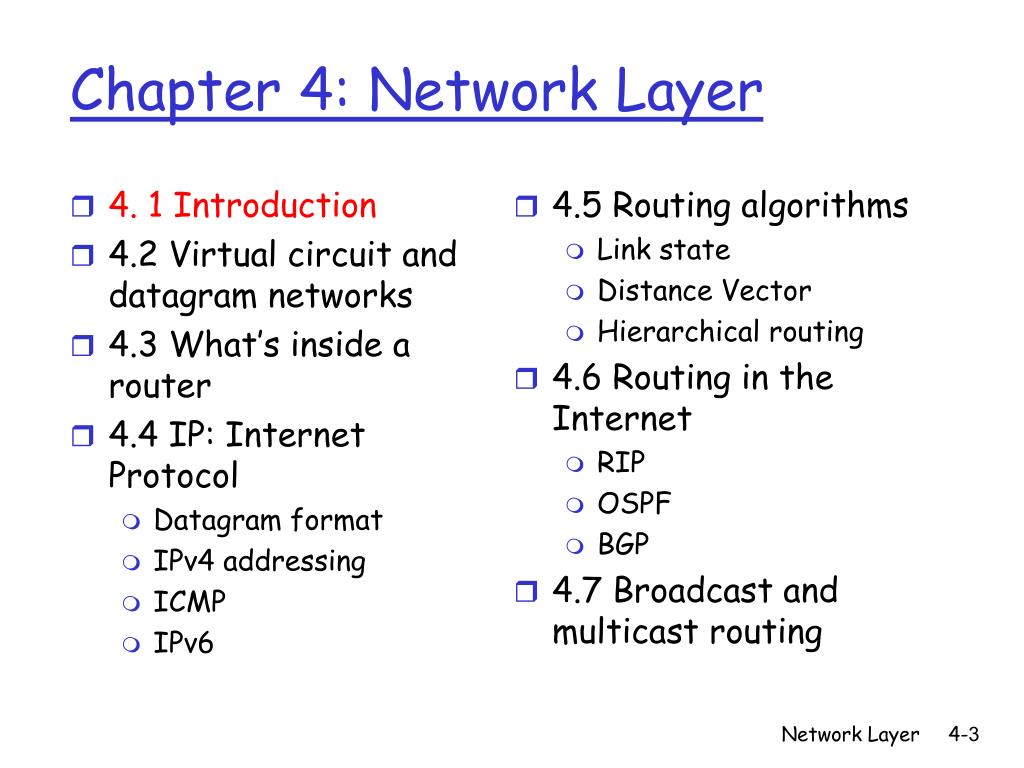 4. 1 Introduction 4.2 Virtual circuit and datagram networks 4.3 What’s inside a router 4.4 IP: Internet Protocol Datagram format IPv4 addressing ICMP IPv6 4.5 Routing algorithms Link state Distance Vector Hierarchical routing 4.6 Routing in the Internet RIP OSPF BGP 4.7 Broadcast and multicast routing Chapter 4: Network Layer Network Layer