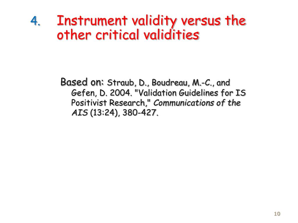 4. Instrument validity versus the other critical validities Based on: Straub, D., Boudreau, M.-C., and Gefen, D. 2004. "Validation Guidelines for IS Positivist Research," Communications of the AIS (13:24), 380-427.