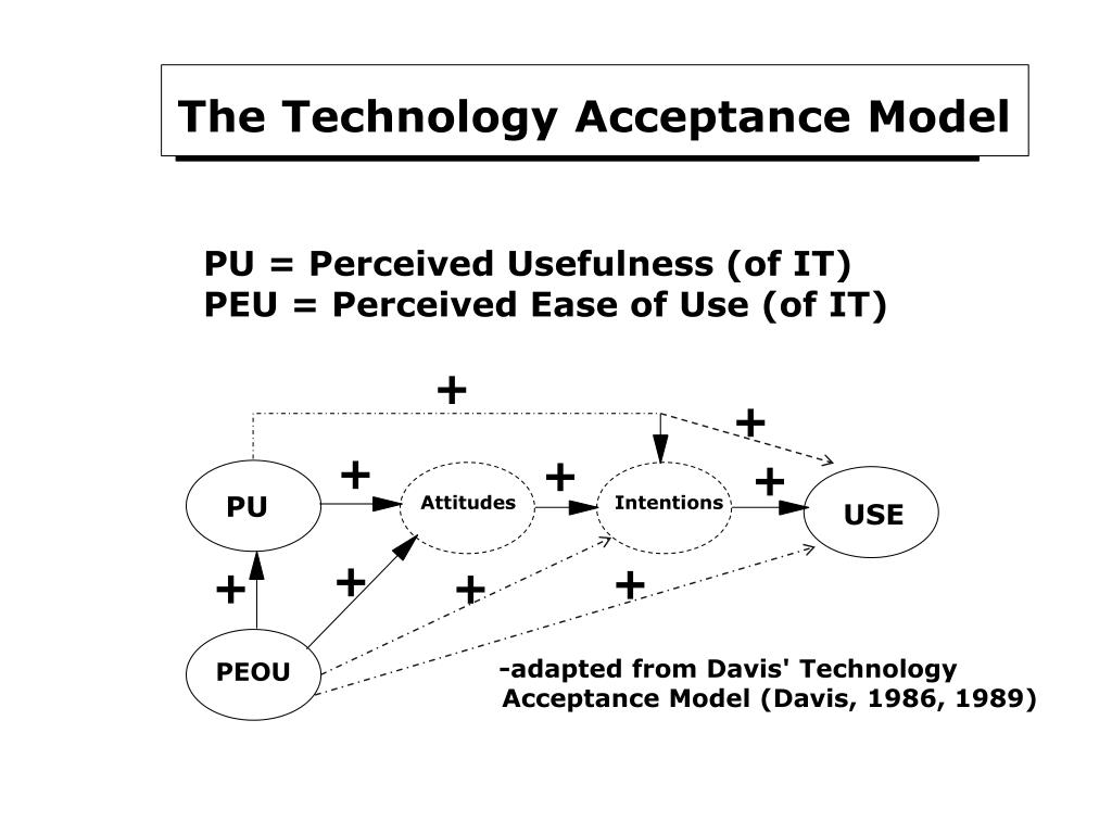 Model The Technology Acceptance Model + + + PU Attitudes Intentions USE + + PEOU Theoretical PU = Perceived Usefulness (of IT) PEU = Perceived Ease of Use (of IT) • -adapted from Davis' Technology Acceptance Model (Davis, 1986, 1989)