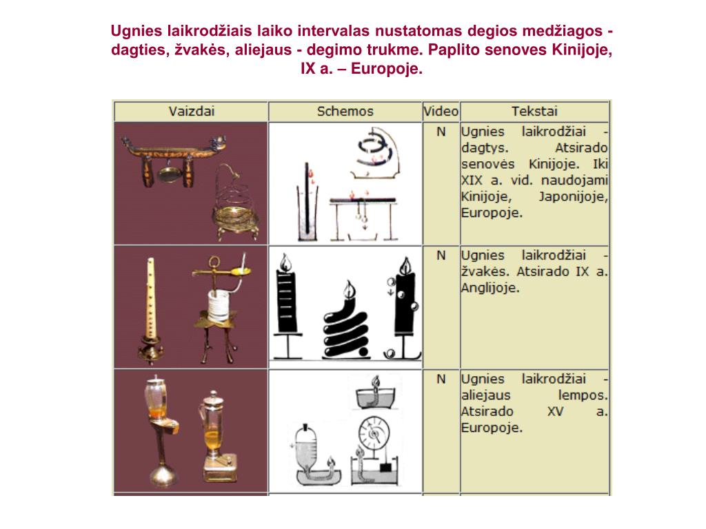 Ugnies laikrodžiais laiko intervalas nustatomas degios medžiagos - dagties, žvakės, aliejaus - degimo trukme. Paplito senoves Kinijoje, IX a. – Europoje.