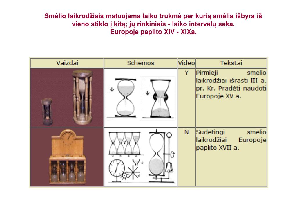 Smėlio laikrodžiais matuojama laiko trukmė per kurią smėlis išbyra iš vieno stiklo į kitą; jų rinkiniais - laiko intervalų seka. Europoje paplito XIV - XIXa.