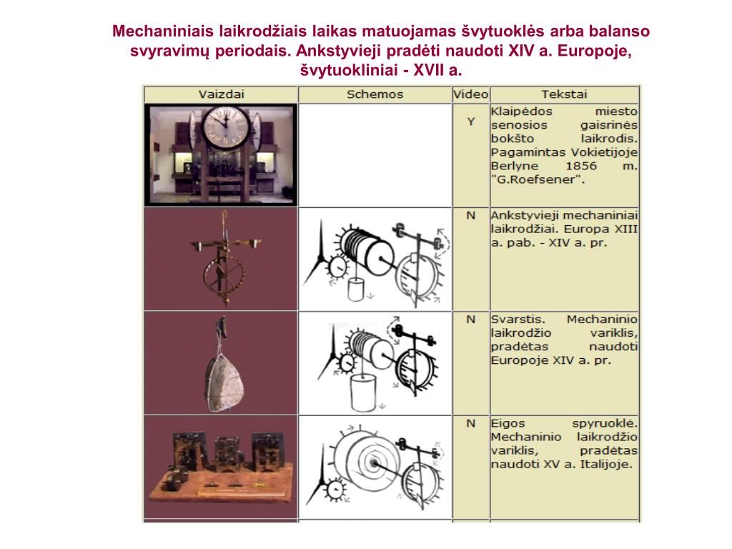 Turinys • Kas yra laikrodis? • Laikrodžio išradėjai • Kalendoriai • Saulės laikrodžiai • Vandenslaikrodžiai • Tekančio vandens energija laikui matuoti • Ugnies laikrodžiai • Smėlio laikrodžiai • Mechaniniai laikrodžiai • Švytuoklinis laikrodis • Elektromechaniniai laikrodžiai • Elektromagnetiniai laikrodžiai • Elektroniniai laikrodžiai • Kvarciniailaikrodžiai • Skaitmeniniailaikrodžiai • Kvantiniai laikrodžiai • Laikrodžių formų vystymosi istorija (Renesansas) • Laikrodžių formų vystymosi istorija (Barokas, Rokoko) • Laikrodžių formų vystymosi istorija (Klasicizmas - Ampyras) • Laikrodžių formų vystymosi istorija (Eklektika) • Laikrodžių formų vystymosi istorija (Modernas) • Mįslės, mįslės.... • Gatvėslaikrodis • Galvosūkis • Informacijosšaltiniai