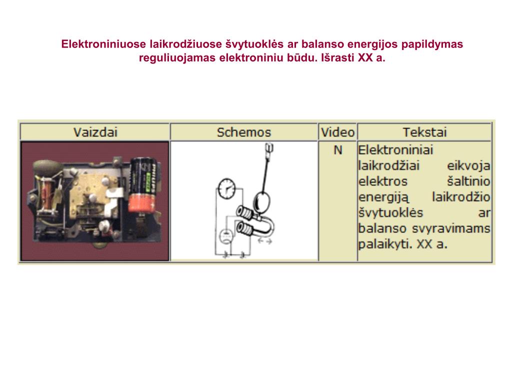 Elektroniniuose laikrodžiuose švytuoklės ar balanso energijos papildymas reguliuojamas elektroniniu būdu. Išrasti XX a.