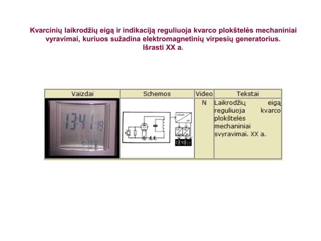 Kvarciniailaikrodžiai Būtenttodėl 1920 metaisanglas V. Marisonasišradokvarcinįlaikrodį. Kvarciniailaikrodžiaiišpopuliarėjodėlsavopatogumo: jųnereikiaužvesti, jielabaitiksliairodolaiką, retaigenda, o baterijosnaujoskartos.