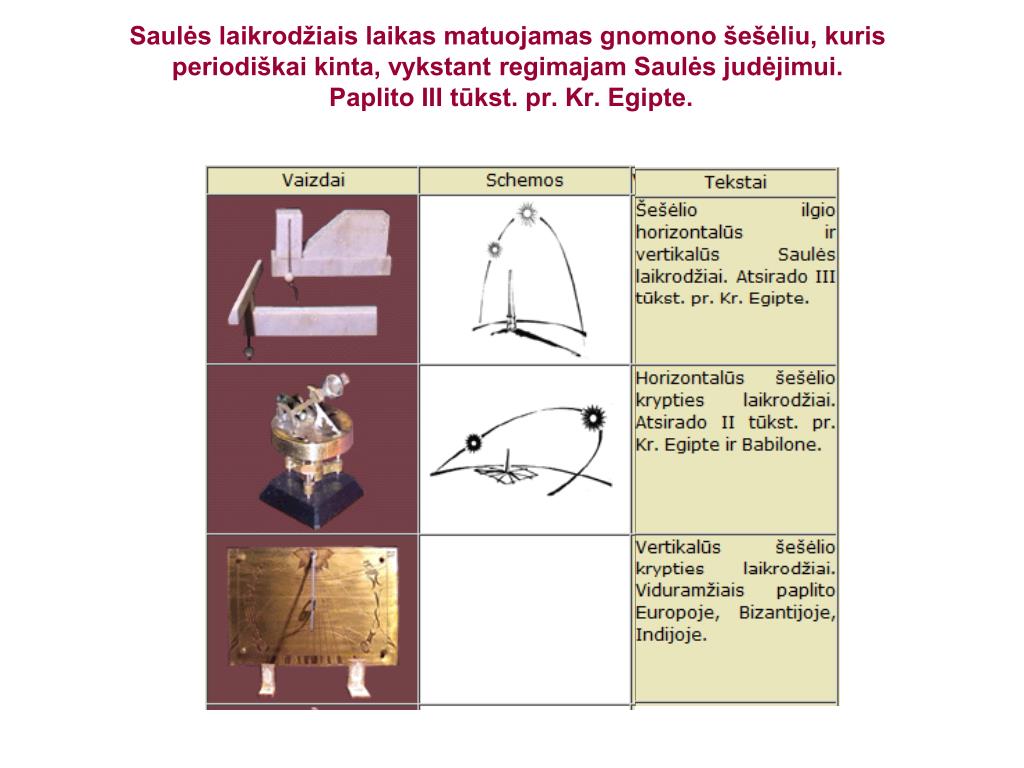 Saulės laikrodžiai Saulės laikrodis išrastas prieš 5000 tūkst. metų Senovės Egipte. Tai prietaisas laikui matuoti pagal Saulės padėtį. Dažniausiai įrengiamas ant pastato sienos, tačiau pirmieji saulės laikrodžiai buvo specialiai statomos kolonos ar obeliskai. Silpnoji saulės laikrodžių savybė – laikas rodomas tik esant saulėtam orui.