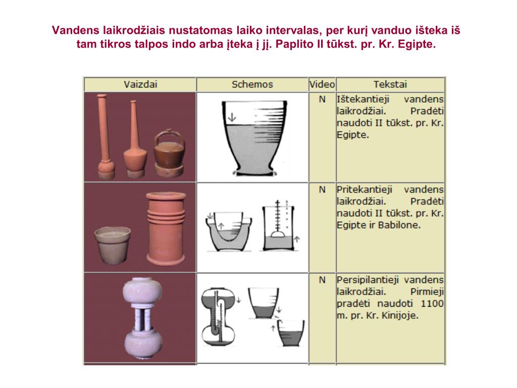 Vandens laikrodžiais nustatomas laiko intervalas, per kurį vanduo išteka iš tam tikros talpos indo arba įteka į jį. Paplito II tūkst. pr. Kr. Egipte.