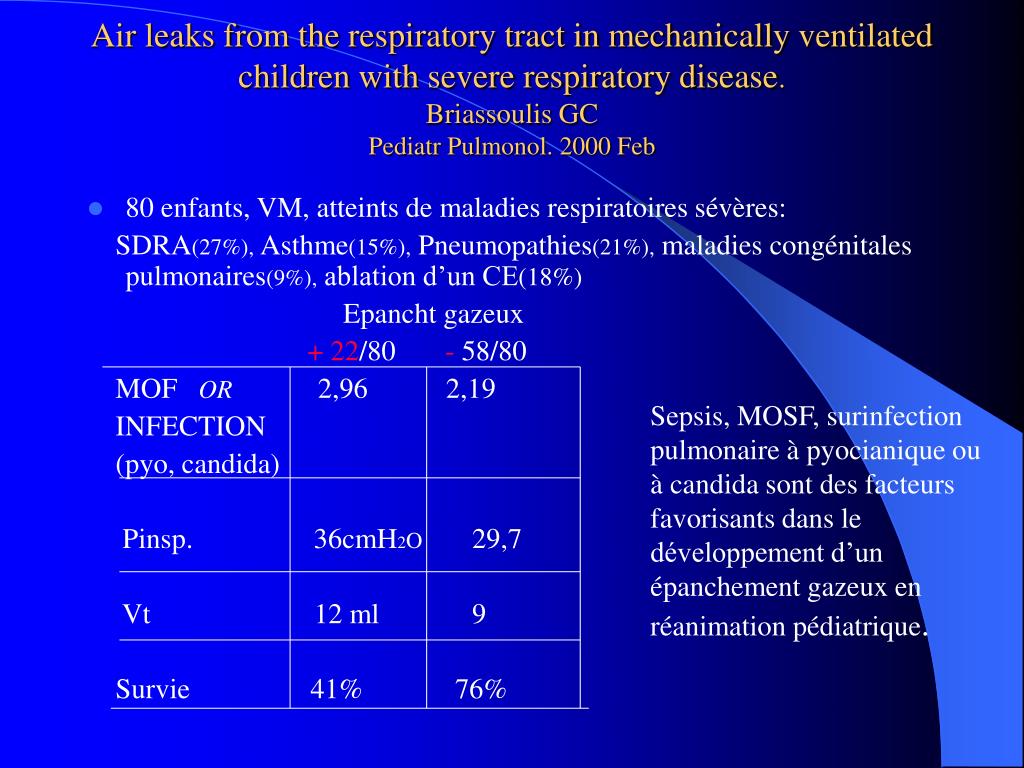 Air leaks from the respiratory tract in mechanically ventilated children with severe respiratory disease.Briassoulis GCPediatr Pulmonol. 2000 Feb • 80 enfants, VM, atteints de maladies respiratoires sévères: SDRA(27%), Asthme(15%), Pneumopathies(21%), maladies congénitales pulmonaires(9%), ablation d’un CE(18%) Epancht gazeux + 22/80 - 58/80 MOF OR 2,96 2,19 INFECTION (pyo, candida) Pinsp. 36cmH2O 29,7 Vt 12 ml 9 Survie 41% 76% Sepsis, MOSF, surinfection pulmonaire à pyocianique ou à candida sont des facteurs favorisants dans le développement d’un épanchement gazeux en réanimation pédiatrique.