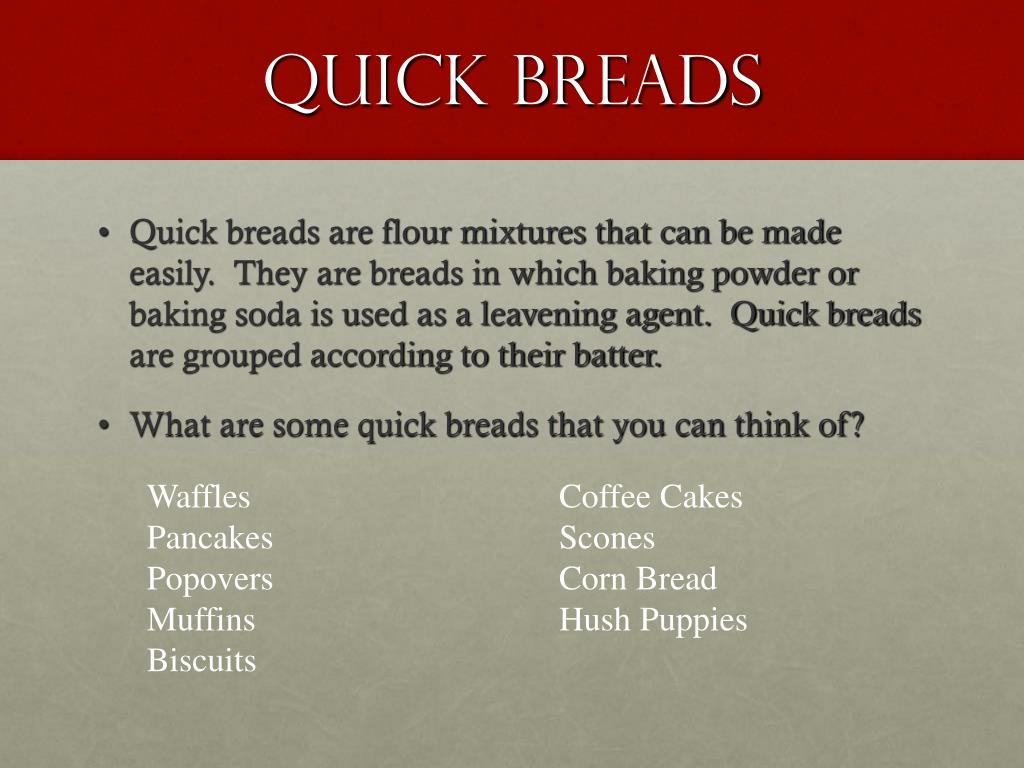 Quick breads • Quick breads are flour mixtures that can be made easily. They are breads in which baking powder or baking soda is used as a leavening agent. Quick breads are grouped according to their batter. • What are some quick breads that you can think of? • Waffles • Pancakes • Popovers • Muffins • Biscuits • Coffee Cakes • Scones • Corn Bread • Hush Puppies