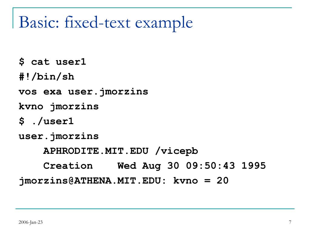 Basic: fixed-text example $ cat user1 #!/bin/sh vos exa user.jmorzins kvno jmorzins $ ./user1 user.jmorzins APHRODITE.MIT.EDU /vicepb Creation Wed Aug 30 09:50:43 1995 jmorzins@ATHENA.MIT.EDU: kvno = 20