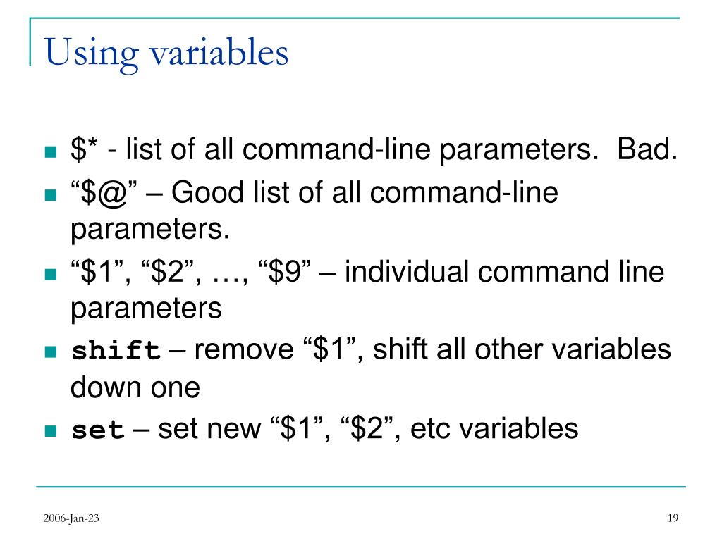 Using variables • $* - list of all command-line parameters. Bad. • “$@” – Good list of all command-line parameters. • “$1”, “$2”, …, “$9” – individual command line parameters • shift – remove “$1”, shift all other variables down one • set – set new “$1”, “$2”, etc variables