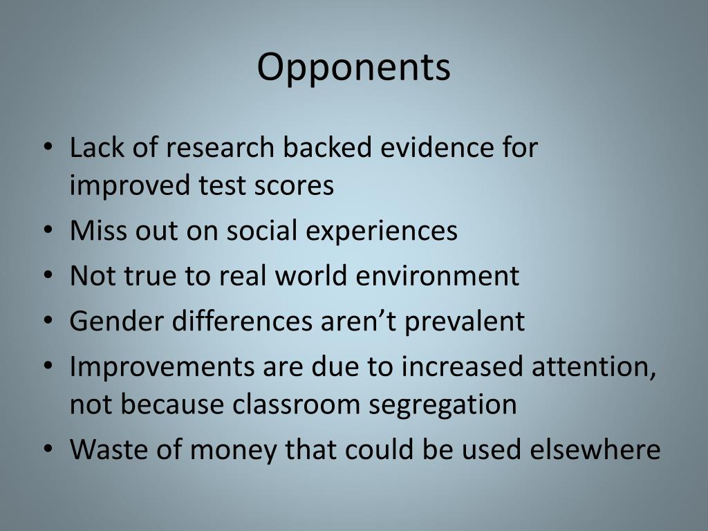 Opponents • Lack of research backed evidence for improved test scores • Miss out on social experiences • Not true to real world environment • Gender differences aren’t prevalent • Improvements are due to increased attention, not because classroom segregation • Waste of money that could be used elsewhere