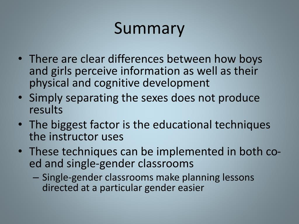 Summary • There are clear differences between how boys and girls perceive information as well as their physical and cognitive development • Simply separating the sexes does not produce results • The biggest factor is the educational techniques the instructor uses • These techniques can be implemented in both co-ed and single-gender classrooms • Single-gender classrooms make planning lessons directed at a particular gender easier