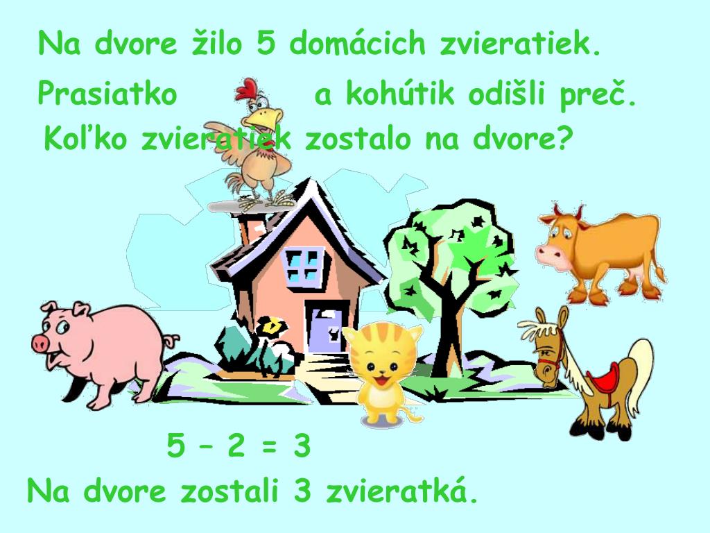 Na dvore žilo 5 domácich zvieratiek. Prasiatko a kohútik odišli preč. Koľko zvieratiek zostalo na dvore? 5 – 2 = 3 Na dvore zostali 3 zvieratká.