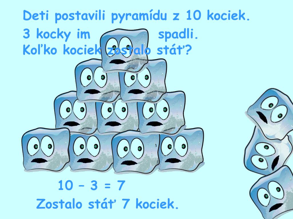 Deti postavili pyramídu z 10 kociek. 3 kocky im spadli. Koľko kociek zostalo stáť? 10 – 3 = 7 Zostalo stáť 7 kociek.